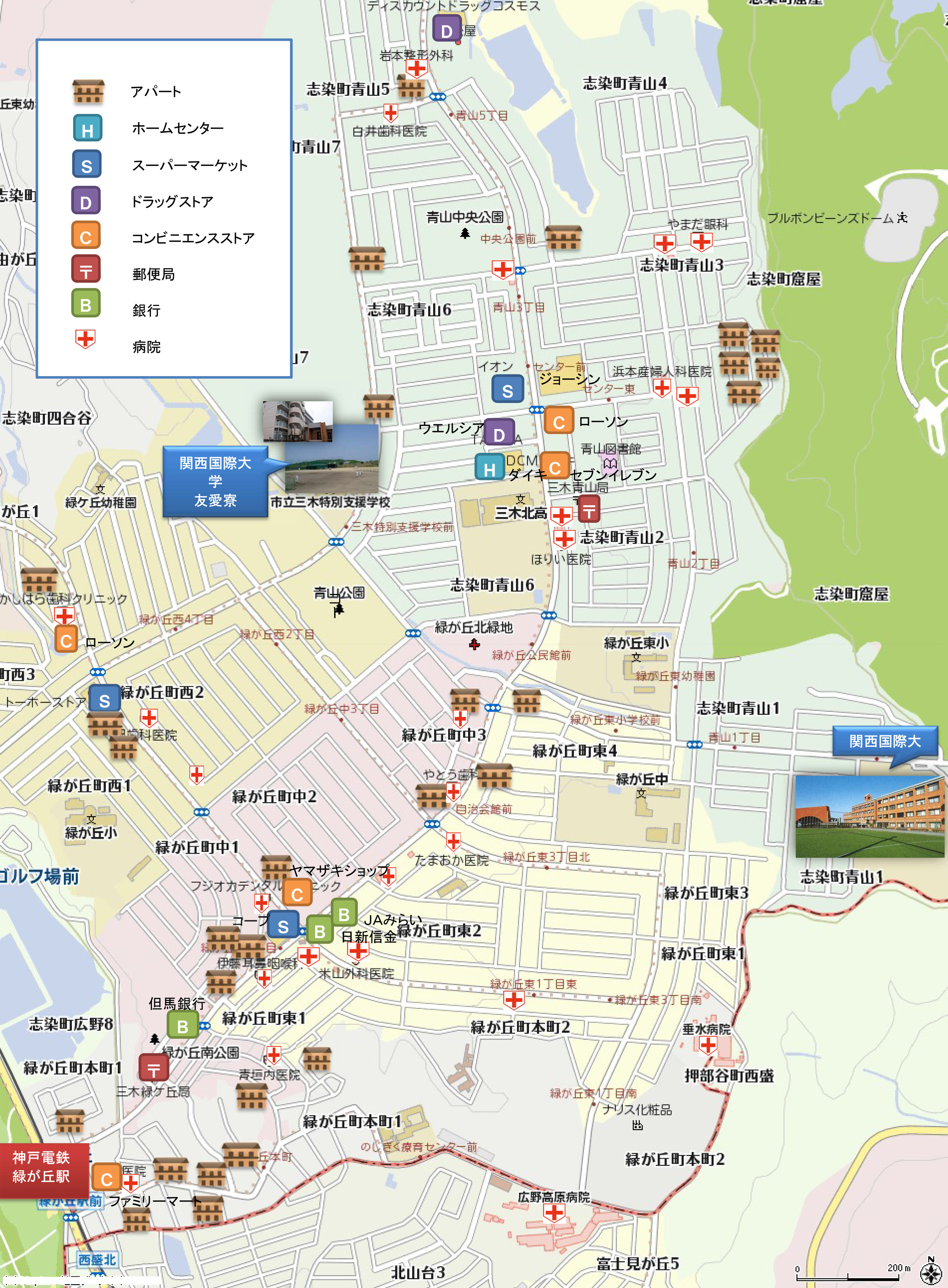 三木駅付近のアパートは神戸電鉄 三木駅から本学最寄の緑が丘駅まで約11分のため通学に便利です。本学周辺のアパートと同じく、生活がしやすい環境にあります。