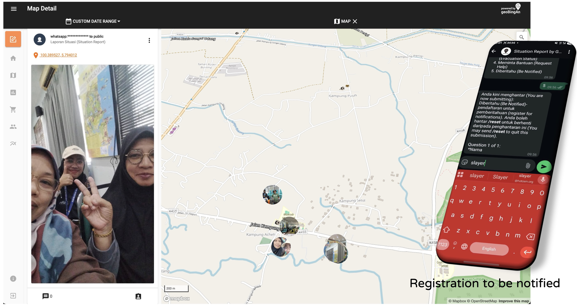 今回の避難訓練は、「ICTの効果的な活用によるコミュニティの災害対応能力の向上」を目的とし、GeoThings社(台湾)が開発したコミュニティにおける災害時情報共有システム「geoBingAn」を使って行われました。「geoBingAn」は、インドネシアで広く親しまれているコミュニケーションアプリ「WhatsApp」を用いて被災状況や必要な物資の情報などをやり取りするシステムです。