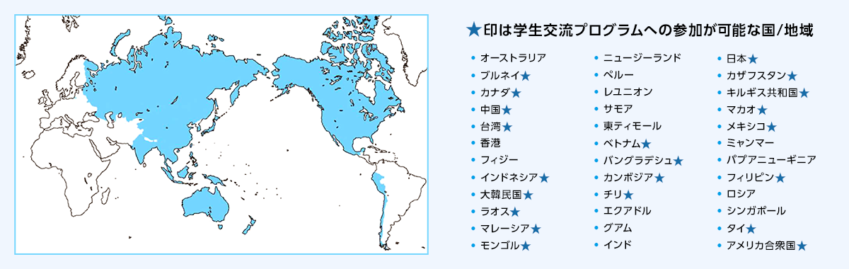 - 留学ができる大学は、UMAPのProgram Aに参加している大学です。時期によって参加大学は変わりますので、応募を希望する期の募集情報をUMAPホームページから確認してください。