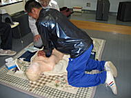 まず最初に応急処置の必要性について、ビデオ映像を取り入れた講義を受けました。続いて人形を相手に心肺蘇生に挑戦しました。処置後5分間の効果確認を行い、修得できたかどうか判定してもらいました。学生たちは最初は照れながらも、一人ひとり講師の方の指導を受け、真剣な表情で取り組んでいました。最後に心肺蘇生法を交えたAEDの使い方を練習して、3時間という長い講習会を終了しました。
