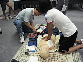 ビデオによる講習の後、8人ずつ2グループに分かれ、人形を使って心肺蘇生法(人工呼吸と心臓圧迫)とAEDの使い方を教わりました。消防隊員の方から的確なアドバイスや説明を受けながら、繰り返し練習しました。最初は上手くできなかった人も最後にはスムーズに行えるようになり、いざという時に対処できる自信をつけたようです。受講者からは活発に質問があり、講習会は終始なごやかに行われました。