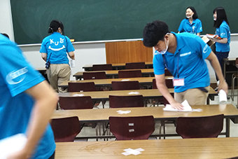 コロナ対策も念入りに、座席の間隔を空けたり、換気・消毒を徹底しての開催です。下の写真は、後片付けの際に、一生けんめい消毒作業に勤しむ学生スタッフの姿です。
