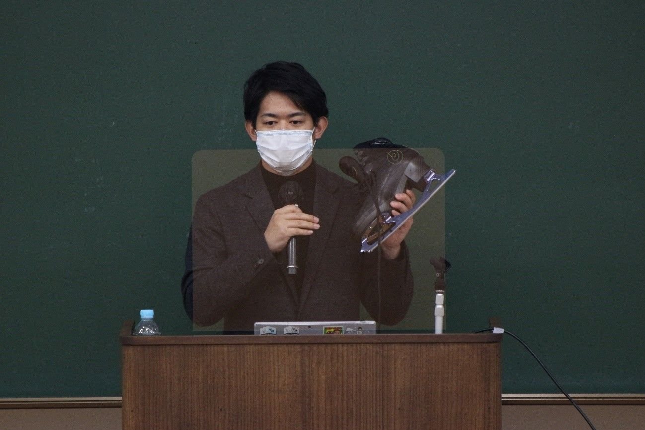 講演では、まずはオリンピックの起源や歴史についてクイズを交えながら説明され、続いて現役時代の動画の紹介や、現在の活動について、わかりやすく丁寧に語られました。特に、元選手の経験を生かして開発に取り組まれているKOZUKA BLADES(ブレード)は、ひとつの金属の塊から削り出す特殊な製造方法で、興味深い内容でした。