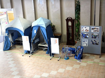 防災士養成講座では防災分野の専門家である複数の先生方にお越しいただいて実施していますが、今年も昨年度に引き続き、尼崎市公営企業局上下水道部の皆様にもお越しいただき、災害時に必要となる『応急給水拠点』と『マンホールトイレ』の重要性及び具体的な運用時における課題なども踏まえながらご紹介いただきました。また、学生達がより身近に感じられるようにと、講座開講期間中、尼崎キャンパス1Fエントランスに仮設給水栓やマンホールトイレを展示いただきました。