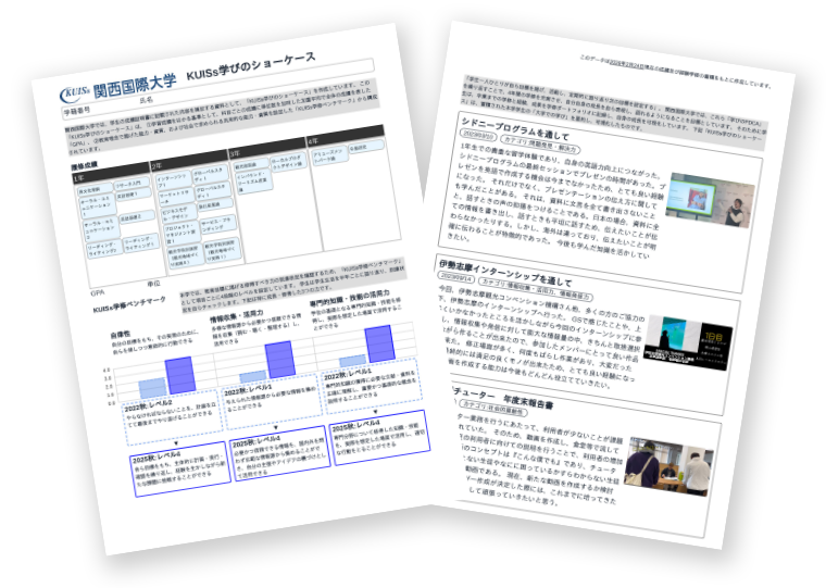 将来の目標から逆算して計画を立て、振り返りと改善を繰り返す。このサイクルを支えるのが、「KUISs学修ベンチマーク」です。卒業時の到達目標を可視化し、半年に一度の自己評価を行うことで、社会で通用する能力を段階的に身につけていくことができます。