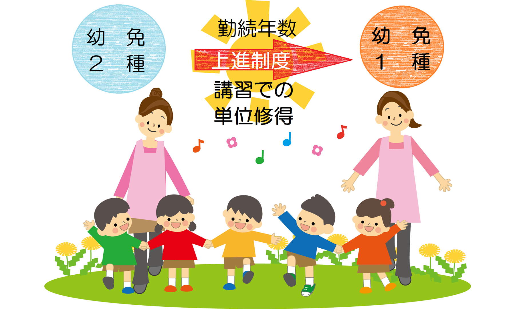 - 幼稚園教諭2種の免許状をお持ちの先生が、勤続年数に応じた単位を修得することで、幼稚園教諭1種の免許状を取得するために必要な単位修得の機会を提供します。