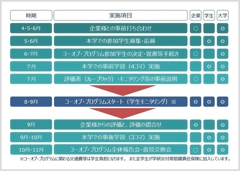 - ① 事前の綿密な打合せなど大学も積極的に関与しつつ実習内容を開発していく「産学協同型プログラム」です。